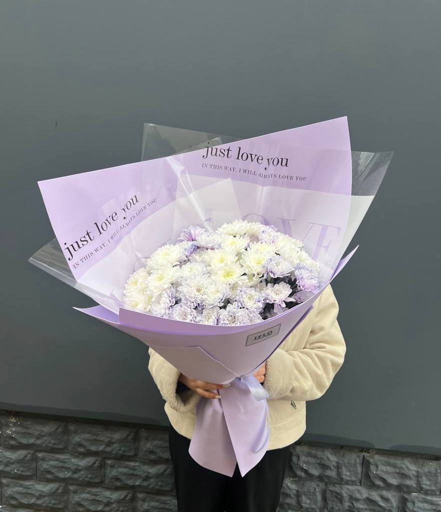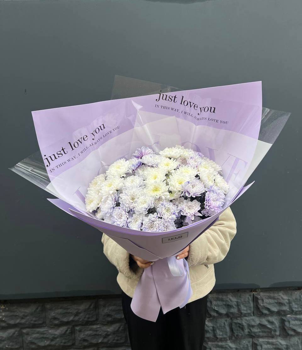 Девять пышных хризантем с переходом от сиреневого к белому собраны в аккуратную композицию. Лавандовая упаковка дополняет холодную гамму и создаёт цельное впечатление. Букет хорошо держит форму и подходит для размещения в высокой вазе.