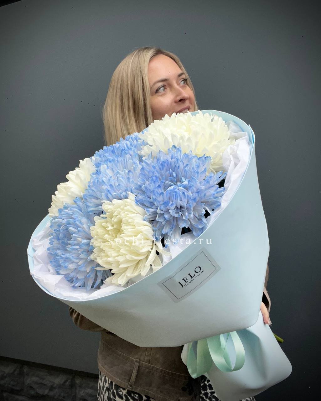 Семь крупных хризантем с открытыми бутонами в дизайнерской упаковке. Букет выглядит свежо и современно, легко вписывается в любое пространство.