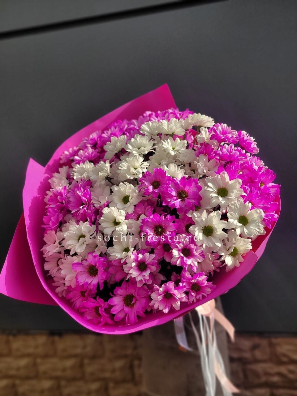 Яркие малиновые соцветия собраны в пышный букет с характерным объёмом. Дизайнерская упаковка подхватывает насыщенный тон и создаёт завершённую форму.