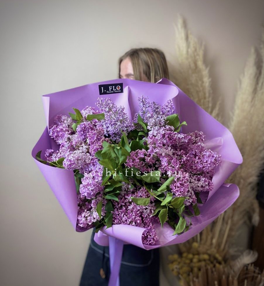 Пятнадцать веток сирени собраны в плотную композицию с выразительным объёмом. Каждая ветвь раскрывает соцветия разной степени распускания, создавая живую глубину. Аромат и форма напоминают о весенних садах в самом ярком их проявлении.