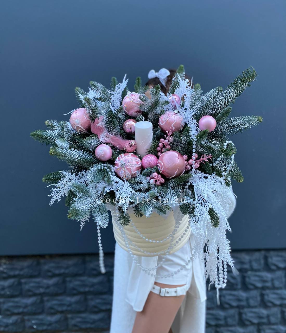Высокая композиция с двумя свечами и обилием нобилиса создаёт торжественную вертикаль. Глубокий зелёный цвет хвои оттеняет блеск игрушек и мерцание огня в центре.