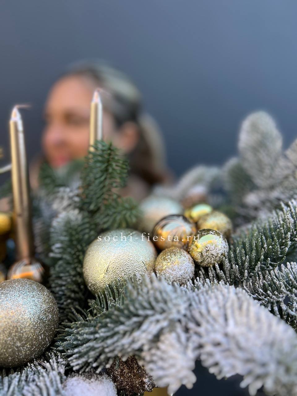 Живые ветки нобилиса образуют плотную композицию вокруг мерцающих свечей. Золотистые акценты в декоре добавляют теплоты зелени и создают камерное новогоднее настроение.