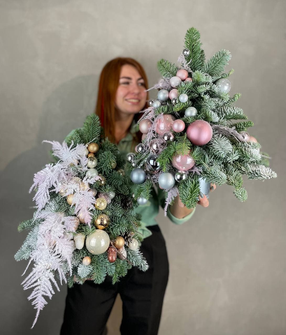 Датский нобилис выстроен в форму небольшой ёлки с украшениями в тонах розового золота. Композиция размещена в кашпо и готова к установке на столе или комоде. Компактное праздничное решение.
