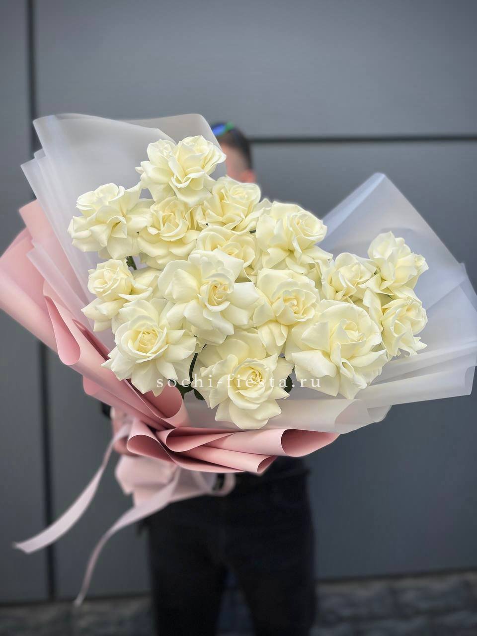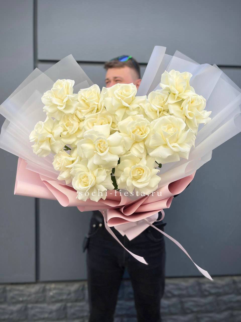Тридцать пять белых бутонов образуют плотный монохромный ансамбль. Классическая форма и чистота оттенка позволяют букету звучать самодостаточно в любом интерьере.