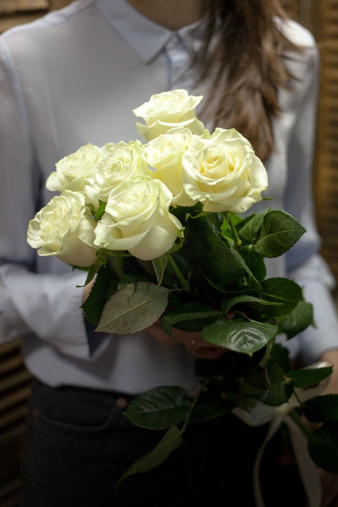 Семь белых бутонов в лаконичной обёртке. Компактная форма и чистота линий делают букет удобным для любого интерьера.