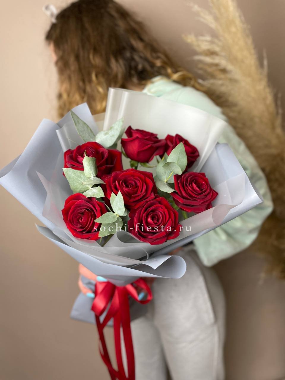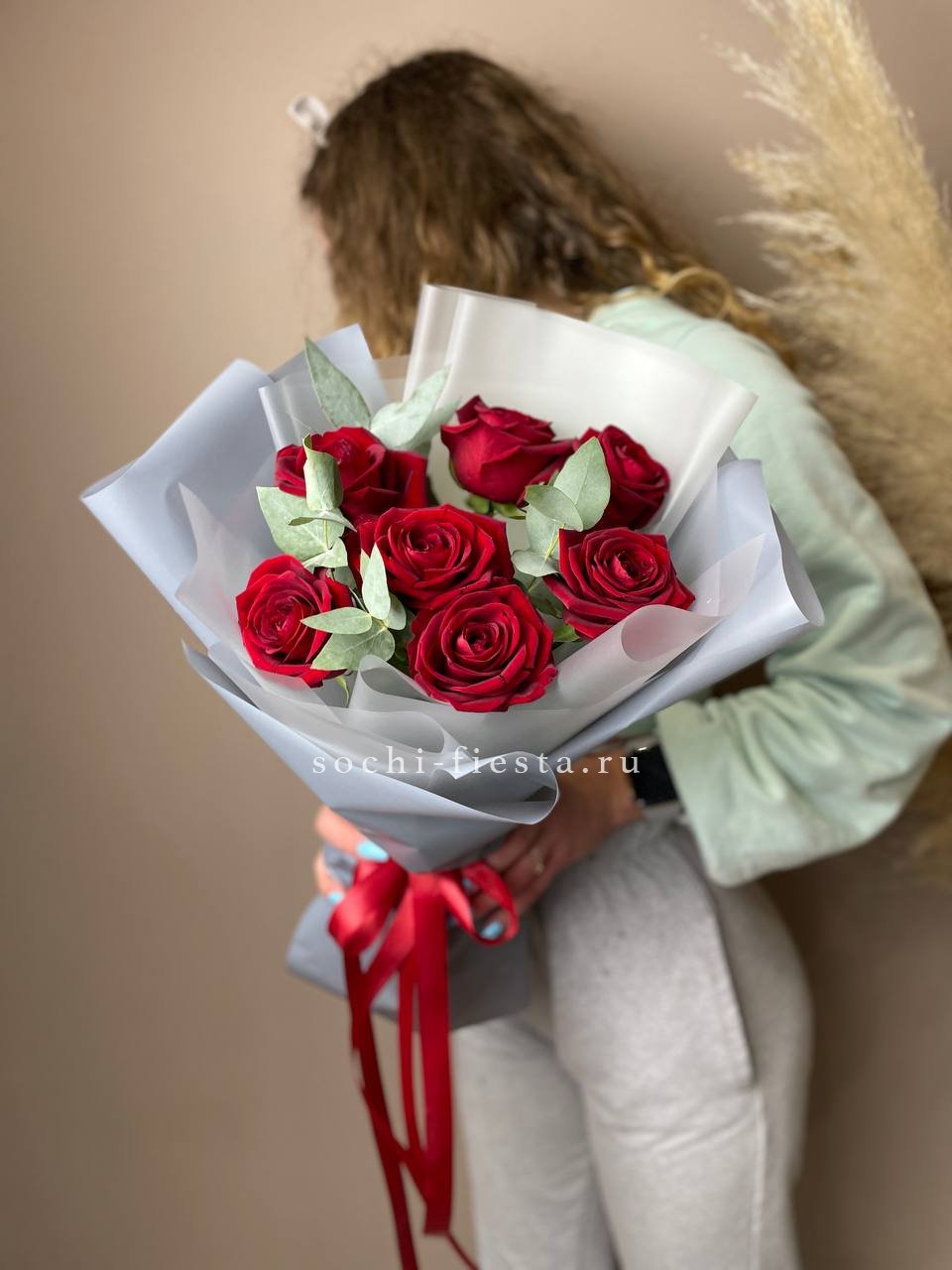 Одиннадцать роз сорта Naomi радуют глубоким красным оттенком и бархатистой поверхностью лепестков. Композиция выглядит свежо и уверенно в любом интерьере.
