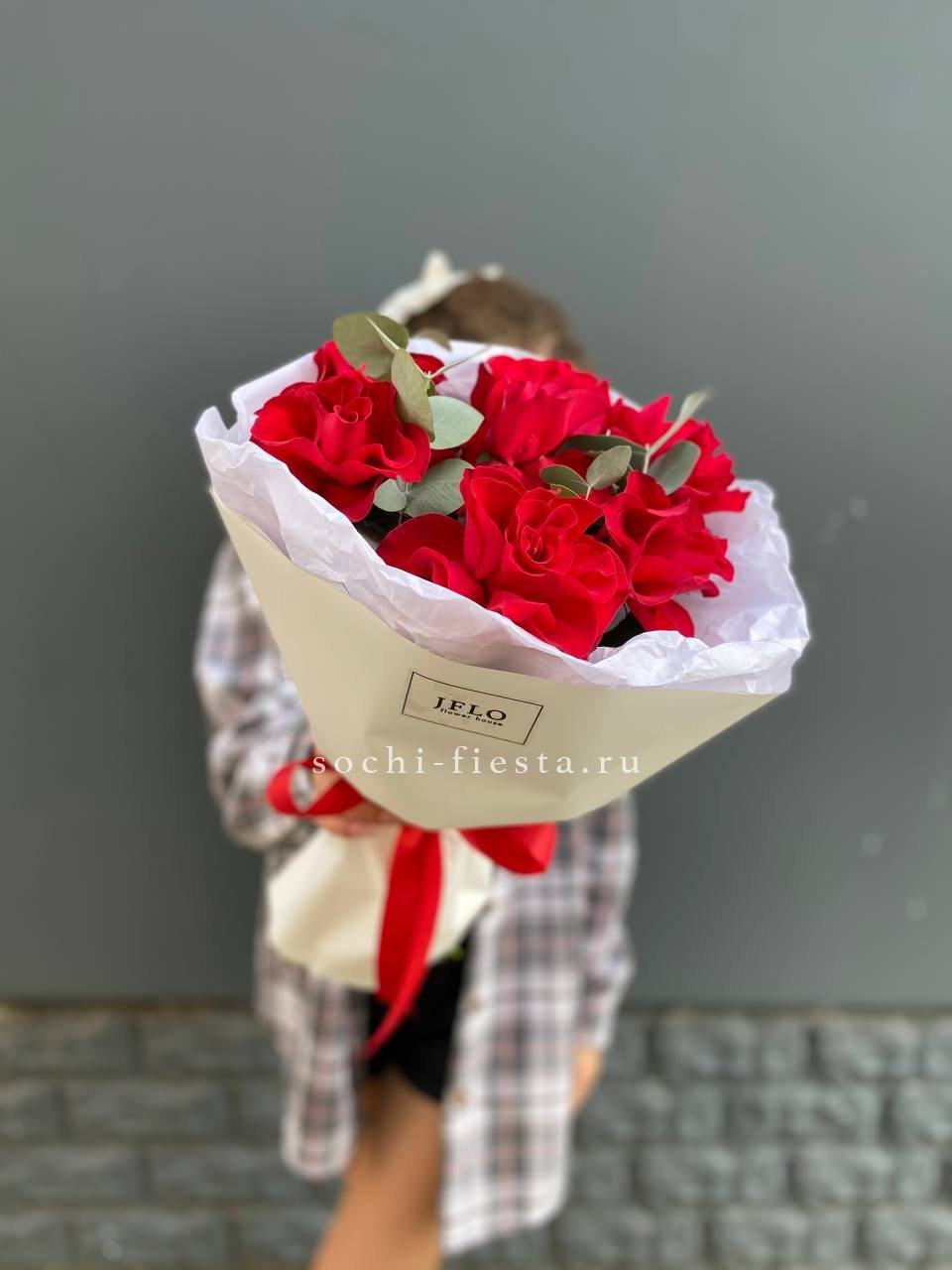 Семь французских роз с крупными бутонами и густой фактурой лепестков. Красный цвет звучит насыщенно и глубоко, а эвкалипт добавляет свежести композиции.