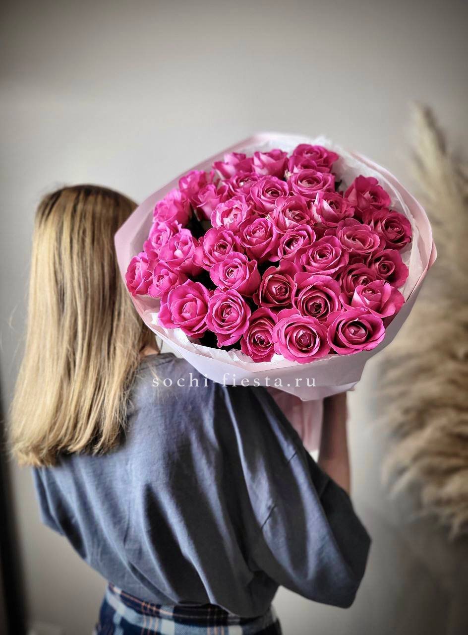 Тридцать пять стеблей формируют объемную композицию в розовой гамме. Букет занимает пространство уверенно и держит форму за счет плотной сборки. Классика, которая работает всегда.