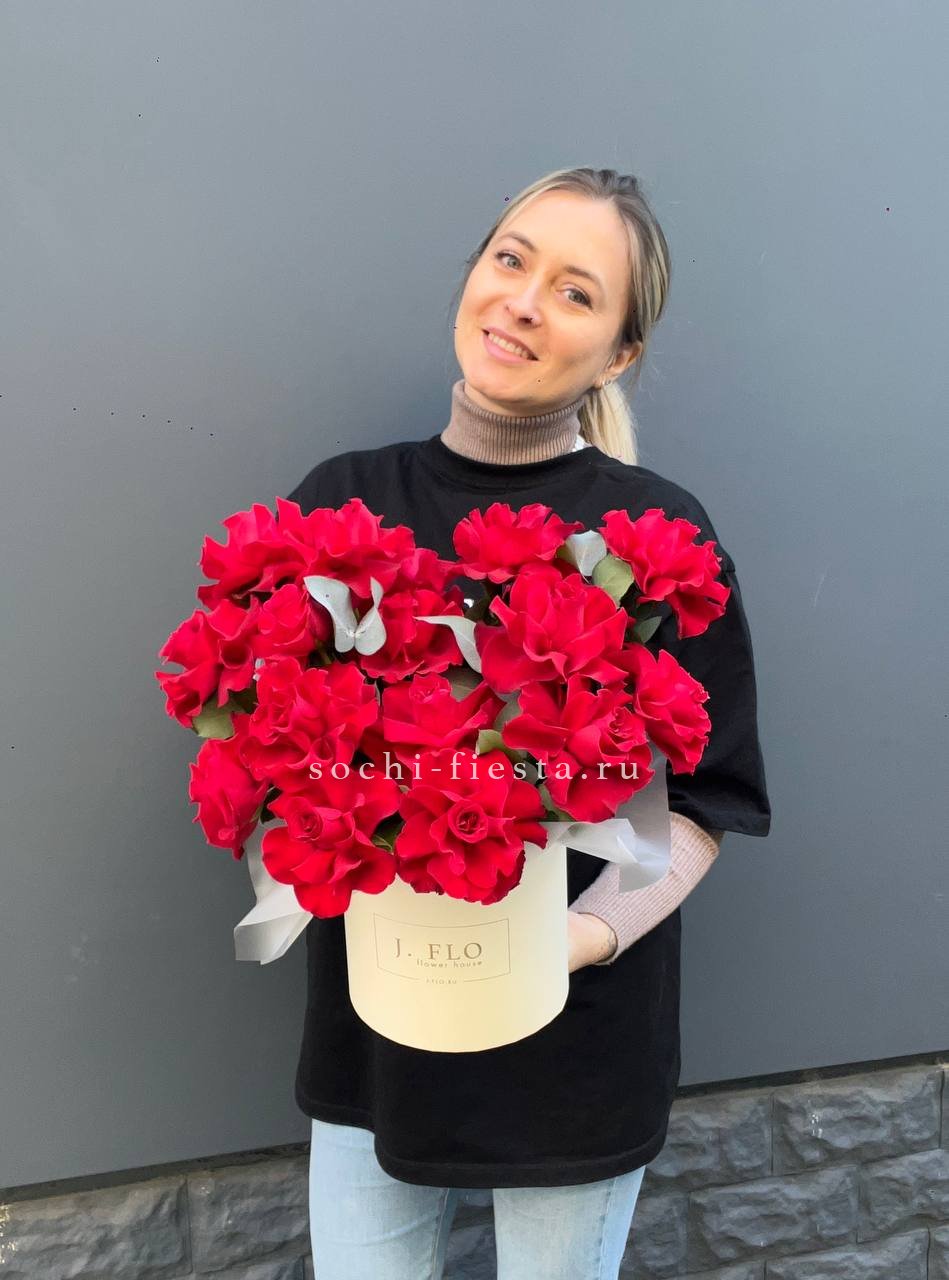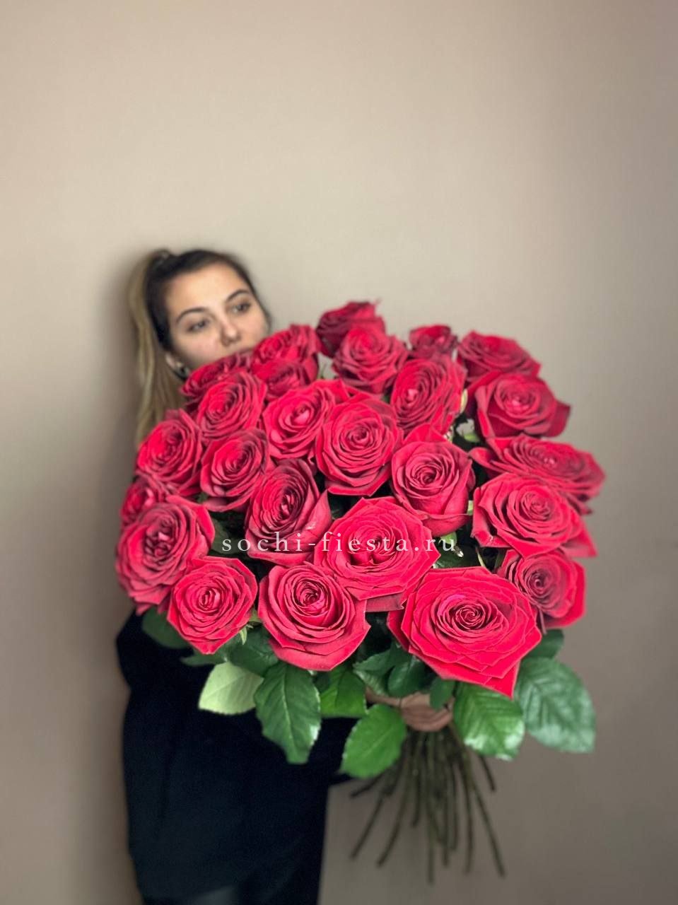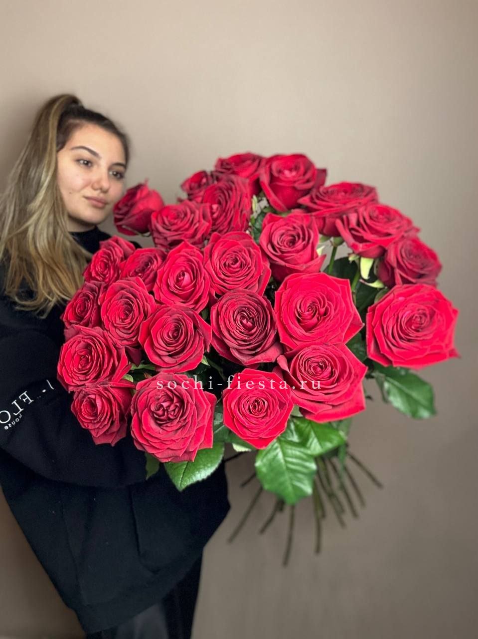 Двадцать пять стеблей выстроены в объёмную композицию с выразительным присутствием. Авторское оформление добавляет завершённость и подчёркивает масштаб букета.
