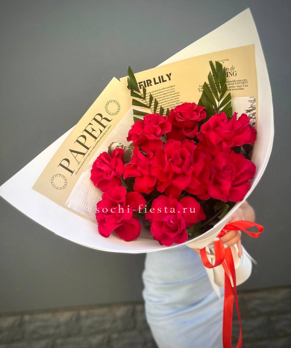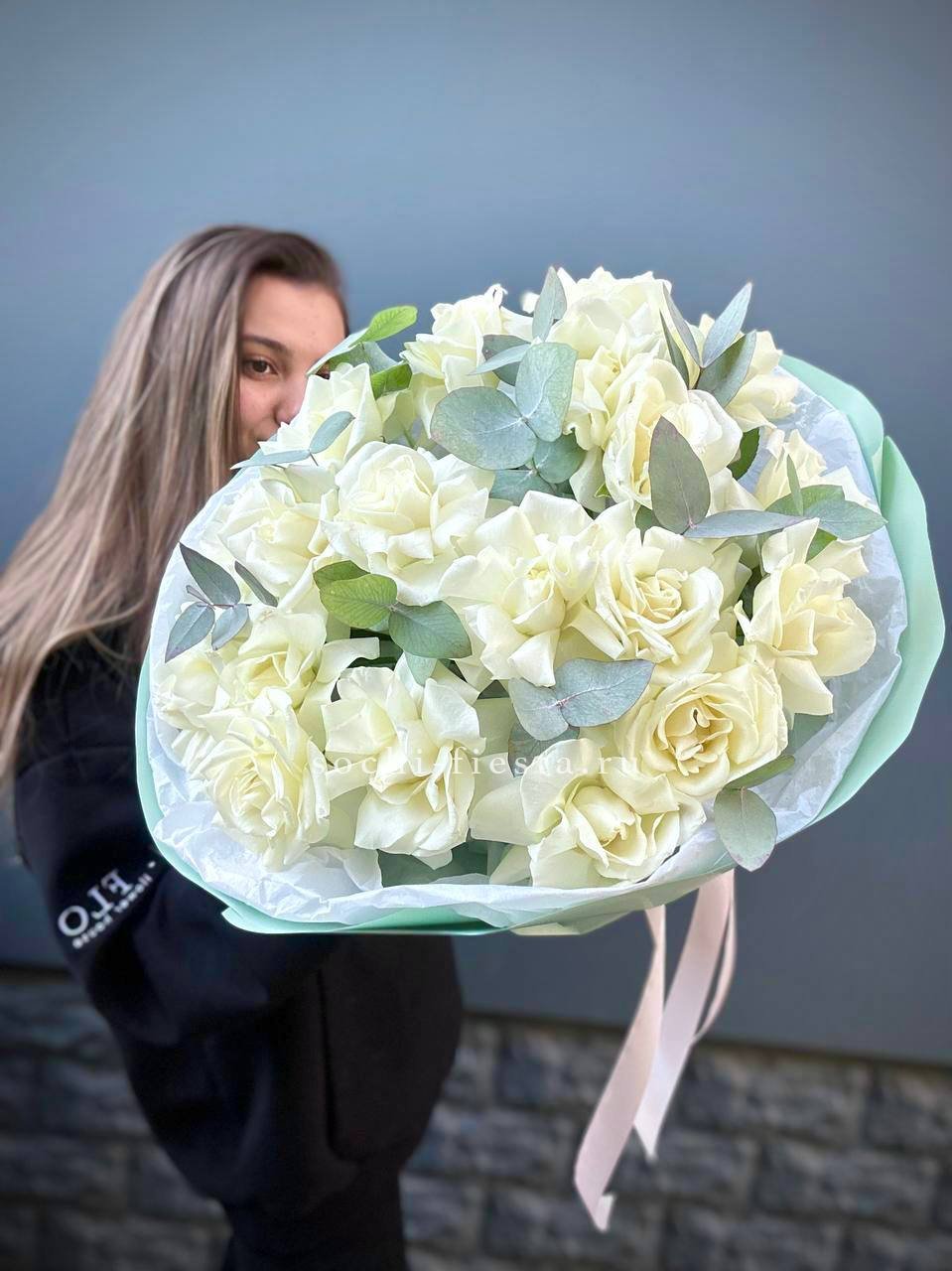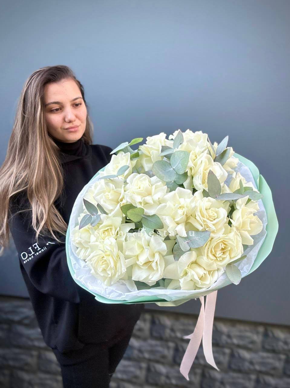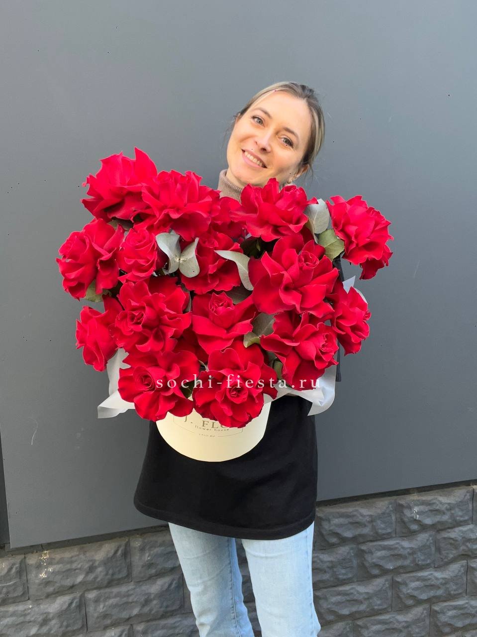 Двадцать пять стеблей выстроены в объёмную композицию с выразительным присутствием. Авторское оформление добавляет завершённость и подчёркивает масштаб букета.