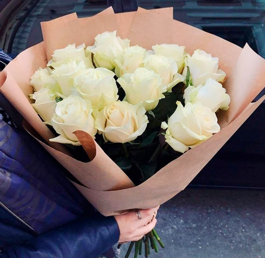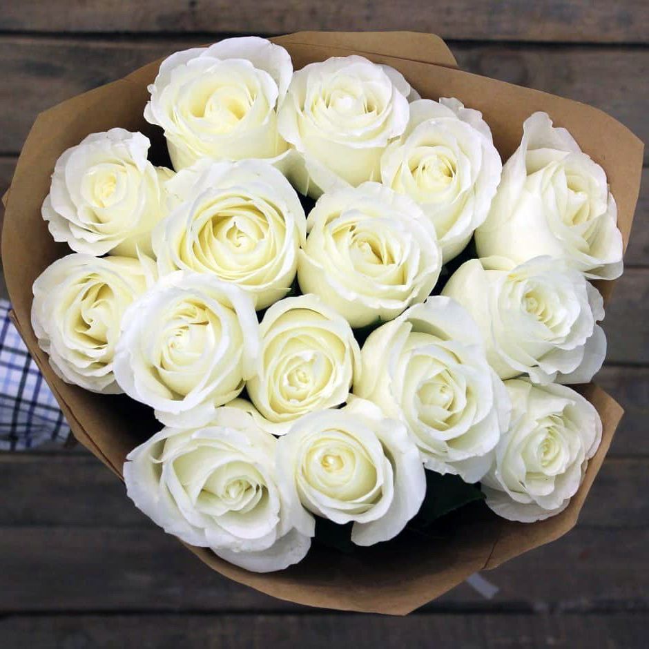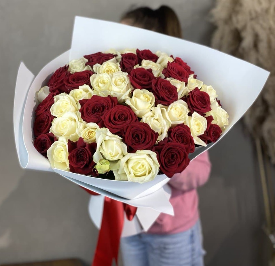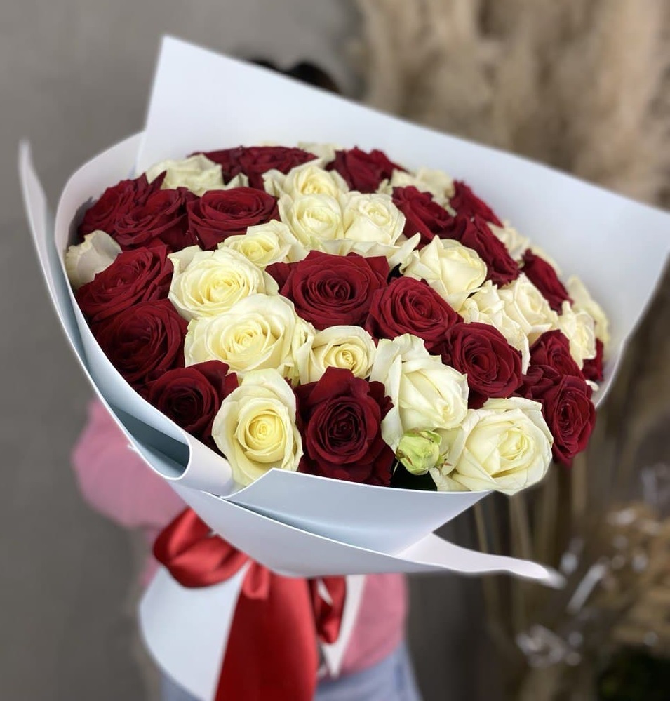Пятьдесят один белоснежный бутон создаёт объёмное облако с мягкими переходами света и тени. Голландские розы держат форму и заполняют пространство плотной текстурой лепестков.
