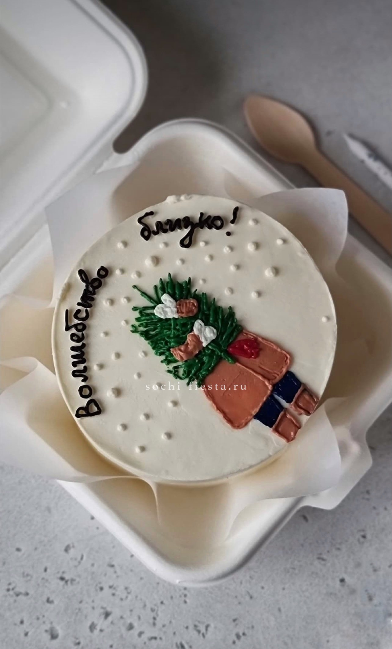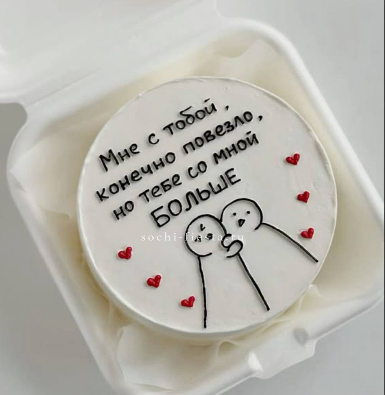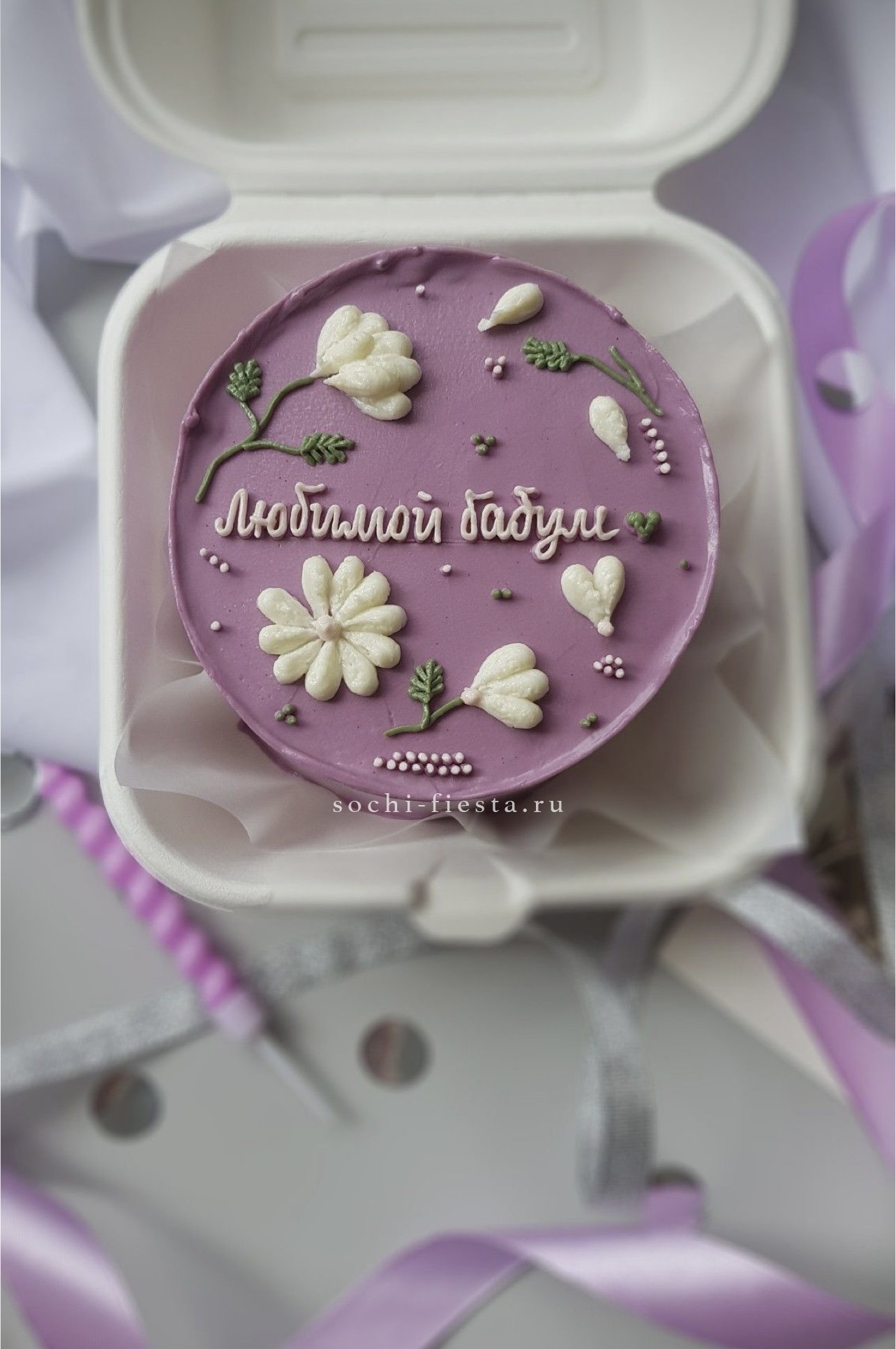 Дизайнерский бенто-торт ручной работы с поздравительной надписью и готовым декором. Формат удобен для камерного чаепития или как дополнение к основному подарку.
